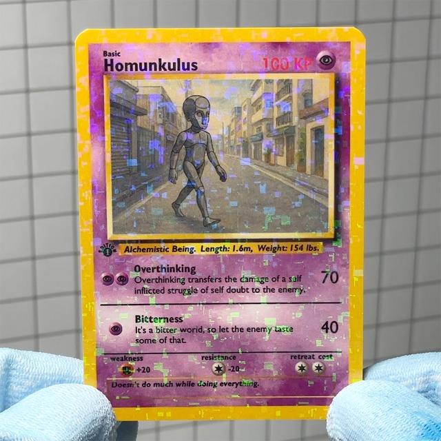 The homunkulus.jp trading card (standard size, 63 × 88 mm, 2.5 x 3.5 inches) is dedicated to the Homunkulus. The front side presents detailed information about the Homunkulus. The back side features a dark blue vertex, reflecting the mental struggle of the creature itself. The card is produced with a pixelated holographic finish on both sides. It is a limited edition release and comes protected in a medium soft vinyl sleeve. The Homunkulus is classified as a psycho type — not because of its psychic powers, but as a direct reference to its real mental health issues. - For orders from outside of Japan, please use PayPal or Amazon Pay as the payment method. Non-Japanese credit cards are not supported. - homunkulus.jp トレーディングカード (標準サイズ:63 × 88 mm、2.5 × 3.5インチ)は Homunkulus に捧げられたカードです。表面には Homunkulus に関する詳細な情報が記されています。裏面には、クリーチャー自身の精神的な葛藤を反映したダークブルーのヴァーテックスが描かれています。 カードは両面にピクセル状のホログラフィック加工が施されています。 本商品は限定版であり、中程度の柔らかさを持つビニールスリーブに収められた状態で提供されます。 Homunkulus は「サイコタイプ」に分類されています。これは超能力的な力を意味するのではなく、実際のメンタルヘルスの問題を直接的に示すものです。